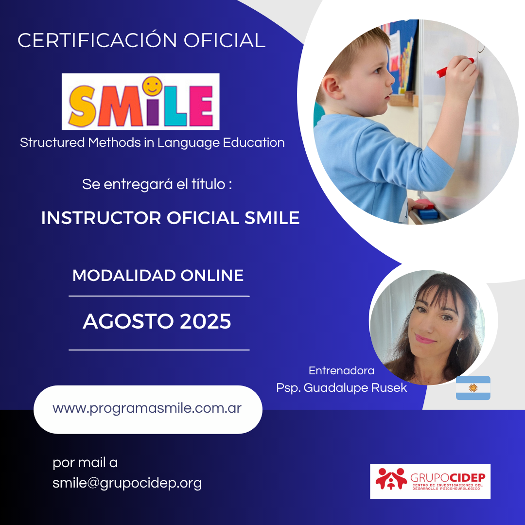 Organizadores: GrupoCIDEP (Argentina) El programa SMILE (Structured Methods in Language Education) está destinado a profesionales que trabajan con niños con trastornos del lenguaje asociado a algún tipo de trastorno del neurodesarrollo. La autora de SMILE es Enid G. Wolf Schein, quien ha entrenado en forma personal a los instructores de GrupoCidep para su aplicación del programa en habla hispana. GrupoCIDEP ha adquirido la licencia exclusiva de la versión en español, y es el encargado de difundir este programa a profesionales de esta lengua. La certificación está dirigida a profesionales del área de la educación y/o salud La certificación oficial SMILE habilita a su uso clínico y educativo. El entrenamiento incluye: Dos encuentros de 4.30hs cada uno y un tercer encuentro de 6.30hs. Los mismos son cada 15 días, para que el alumno pueda practicar lo aprendido y hacer un video donde se pueda observar la aplicación de la técnica. Feed back personalizado sobre la aplicación de la técnica (a través del video) Acceso a la plataforma SMILE donde tendrán acceso al manual y a recursos para utilizar con los alumnos durante dos años. Luego de esa fecha se debe abonar una cuota bianual de U$S25 para acceso a la plataforma. Habilitación para utilizar la técnica SMILE Posibilidad de figurar en la página web en el listado de instructores SMILE Se necesita para el entrenamiento: Material impreso (se les enviará el link para bajar los archivos una semana antes) Hojas en blanco Pizarra blanca, borrador y 5 marcadores de diferentes colores Se sugiere para hacer la capacitación utilizar una computadora PROGRAMA ENTRENAMIENTO SMILE Docente a cargo : Ayelen Toccalino, Lic en Fonoaudiología - Entrenadora oficial SMILE en español DIA 1 Sábado 1 de Noviembre 9 a 13.30hs Introducción : objetivos y descripción del programa Módulo1 : Evaluación Actividades iniciales de atención Enseñanzas de fonemas Armado cuaderno de sonidos y cuaderno de tareas de sonidos ...